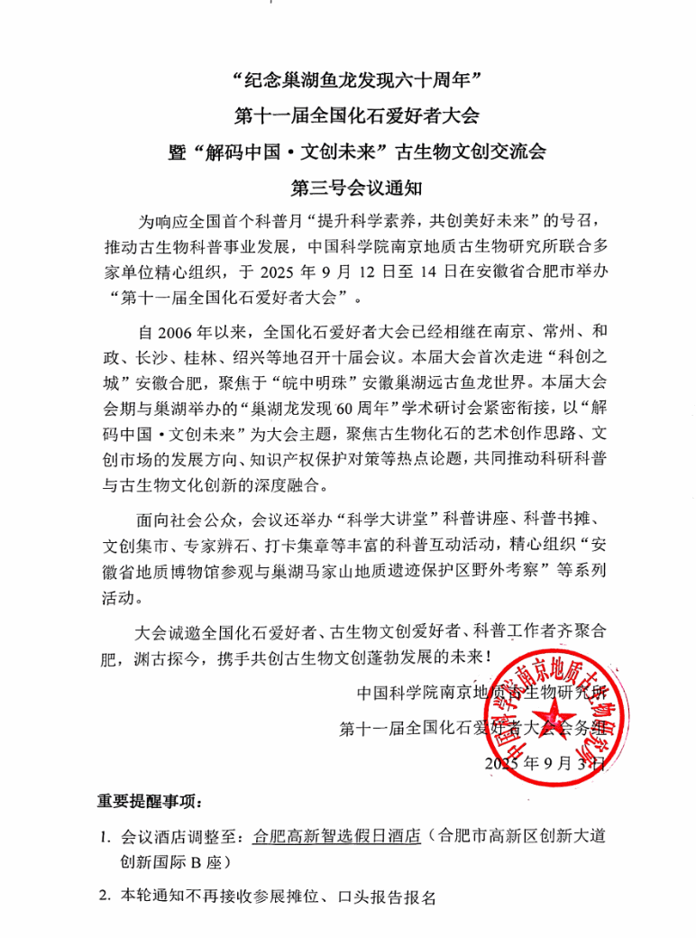 第十一届全国化石爱好者大会暨“解码中国·文创未来”古生物文创交流会第三号会议通知